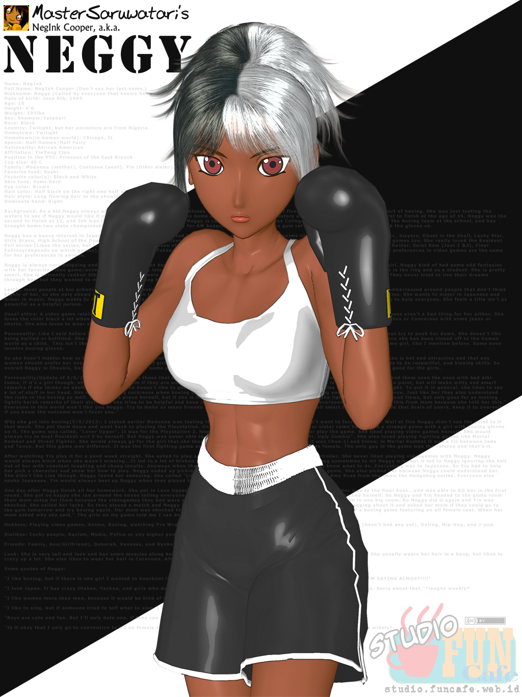 A request from MasterSaruwatari@deviantART on his oc's Neggy. A set of four planned, this is the first installment showing Neggy in her first attire. The hair color is the most tricky part, required 2 rendered images and some photoshop work on finishing.