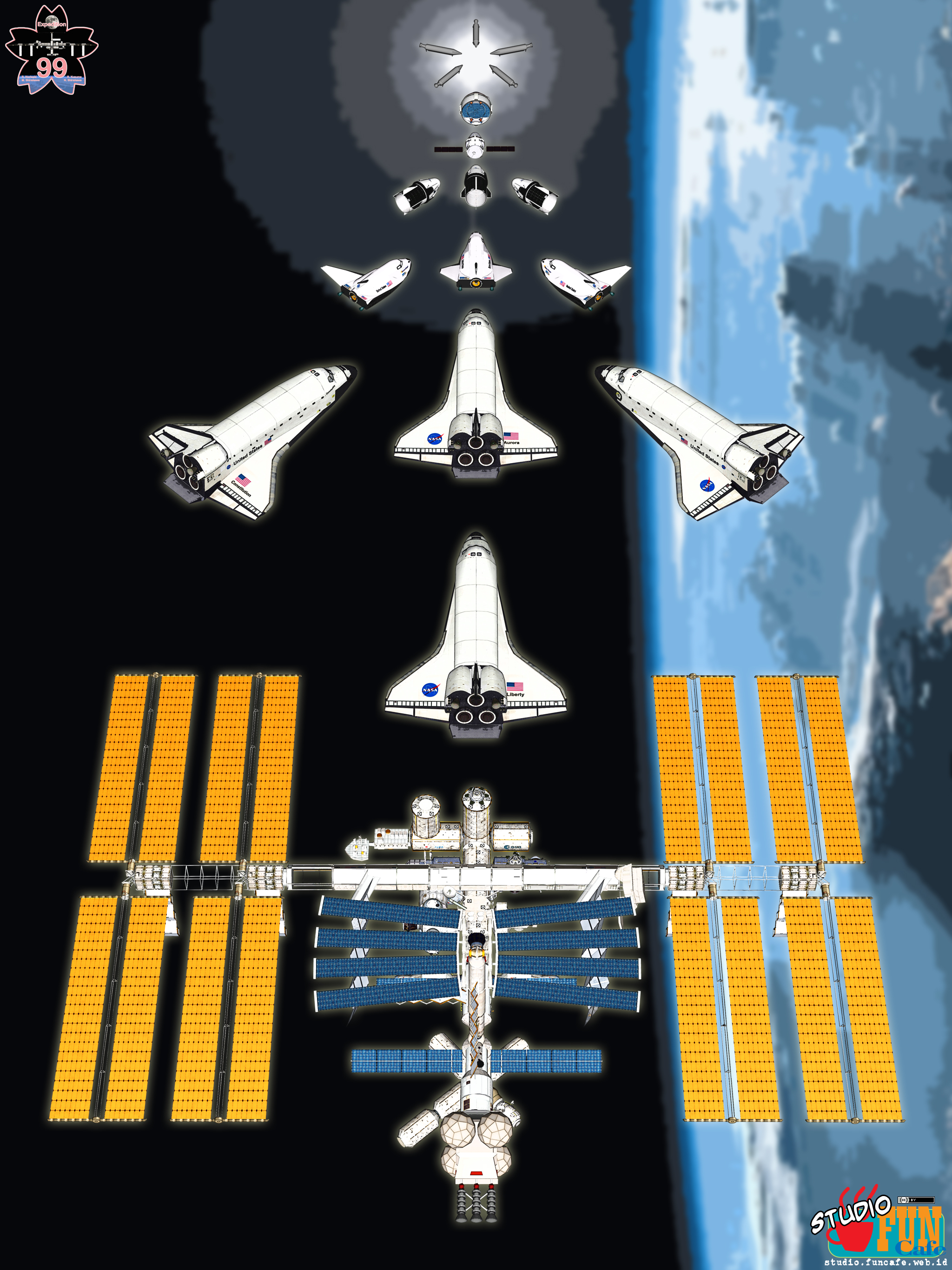 Alternate Christmas greeting card design, made from all spaceships of Expedition 99: Neo-ISS, Neo-Shuttle, Dream Chaser, Crew Dragon, Orel and Starliner.