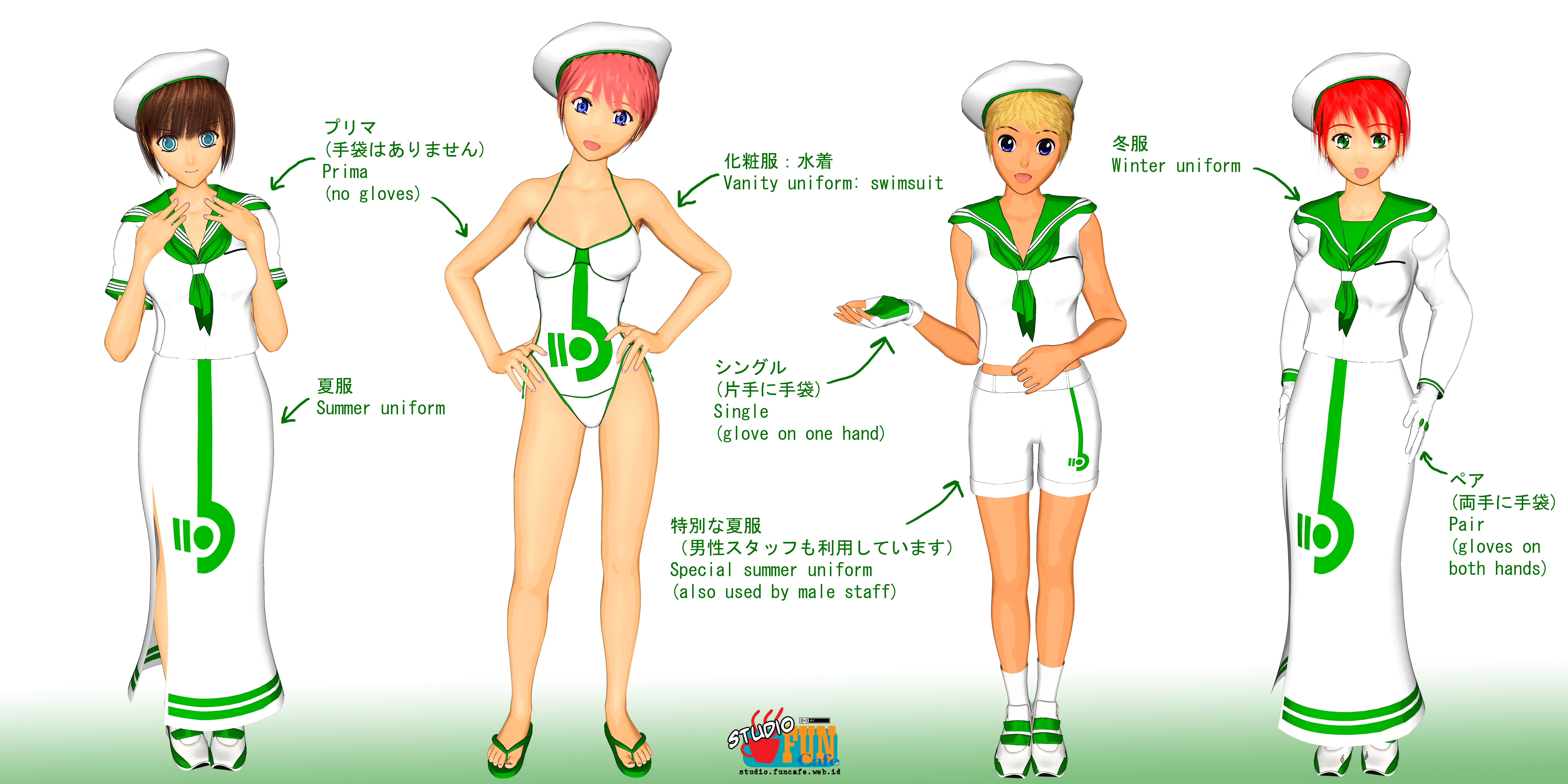 | Title: FC Undines Uniform Lineup Finished: April 21, 2024 Few years ago, I made a fan-art about a non-canon company in Aria Universe. Back then I planned to design full set of uniform, from summer uniform, winter uniform, and vanity uniform. But, that project was never finished. Today, I decided to finished what I left untouched from almost 2 decades ago. These are the full-set of the uniform. The summer uniform and the vanity uniform has been featured on some artwork I made back then. In this version, I slightly modified the design of the sailor blouse while the dress is remain the same. The vanity swimsuit uniform remains the same as back then. The never finished winter uniform finally done with major redesign. Also the new additional special summer uniform which also used as male uniform. The gloves are completely new design, and now they're wearing sneakers instead of boots. For practical reason, they're wearing short pants as in the special summer uniform under the dress skirt. Also some additional accessories were not visibled here, like a legging under the winter dress. I haven't decided if wheter I want to continue the series or not. |